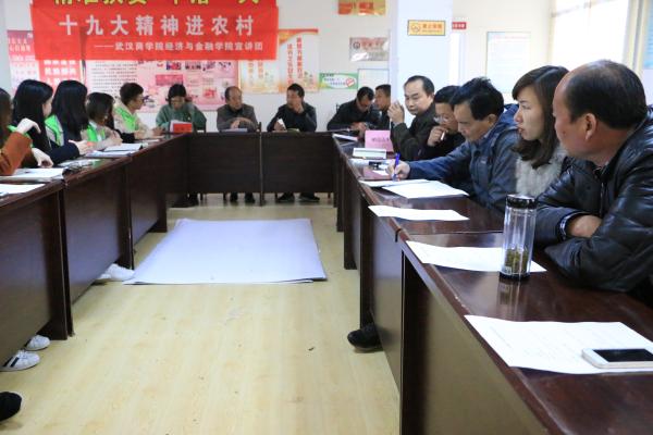 2017年11月21日,经济与金融学院“十九大精神”宣讲团成员前往蔡甸区侏儒山街金鸡村开展“十九大精神”宣讲团进农村活动。经济与金融学院两个结对村--胜洪村、金鸡村村委干部以及结对村老党员参与了此次活动。