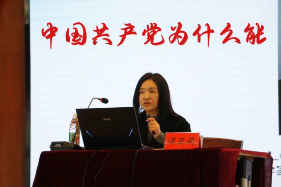 谭亚莉教授从中国共产党的建党历史回顾、建国初期发展经济、到改革开放四十年,生动讲述了中国共产党的成功之道。有力说明了在中国共产党的带领下,中国朝着实现中华民族伟大复兴的方向坚定前行,实现了多方面的世界领先。并和西方国家作比较,阐述了“中国共产党为什么能”的五个原因:理论指导上,是先进性政党;生存根基上,是人民的政党;重要性质上,是使命型政党;内在制度上,是有力的政党;组织韧性上,是善于创新的政党。